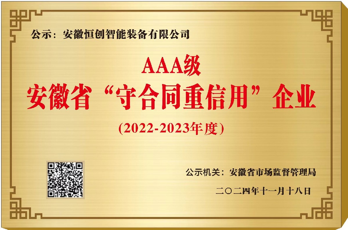 喜訊:熱烈祝賀恒創(chuàng)智能榮獲安徽省AAA級“守合同重信用”企業(yè)