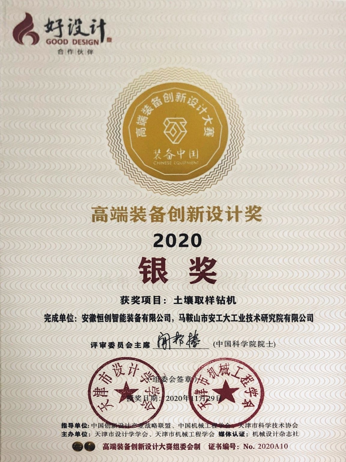 2020中國創(chuàng)新設(shè)計大會天津峰會@云峰會暨“好設(shè)計”合作伙伴“裝備中國”2020年高端裝備創(chuàng)新設(shè)計大賽頒獎典禮及2020“華北地區(qū)好設(shè)計”獎頒獎典禮于2020年11月29日在天津市河北區(qū)隆重召開。安徽恒創(chuàng)智能裝備有限公司與馬鞍山市安工大工業(yè)技術(shù)研究院有限公司共同設(shè)計的土壤取樣鉆機(jī)榮獲本次高端裝備創(chuàng)新設(shè)計獎銀獎。
