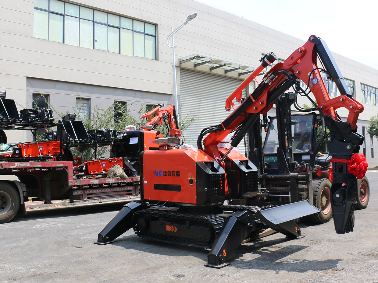 RXR-JM330D-HC型多功能工程機器人是國內(nèi)自主研發(fā)的一種柴油驅(qū)動,用于高危環(huán)境下具有精細化作業(yè)能力的新型高科技裝備。該設(shè)備采用小型履帶運動底盤作為載體,將負載反饋式電液比例系統(tǒng)、基于 CAN 總線的數(shù)字式雙向有線遙控系統(tǒng)以及多參數(shù)傳感系統(tǒng)有機融合,可快速配置液壓錘、挖斗、抓取器、液壓剪等不用作業(yè)屬具,在高溫、高粉塵、易坍塌的危險區(qū)域中靈活地進行全方位遙控的破碎、挖掘、抓取、搬運等多功能作業(yè)。主要應(yīng)用領(lǐng)域有建筑拆除、回轉(zhuǎn)窯維修、礦山、隧道施工、冶金爐窯維修、核工業(yè)。
